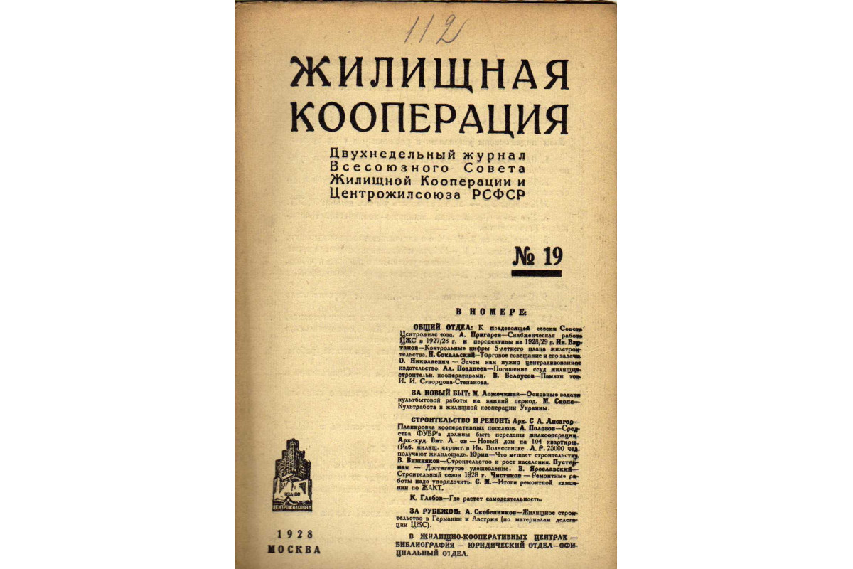 Из содержания: ОБЩИЙ ОТДЕЛ: К предстоящей сессии Совета Центрожилсоюза; Пигарев А. - Снабженческая работа ЦЖС в 1927/28 г. и перспективы на 1928/29 г. Вартанов — Контрольные цифры 5-летнего плана жилстроительства; Н. Сокальский — Торговое совещание и его задачи; О. Николаевич — Зачем нам нужно централизованное издательство; Ал. Позднеев — Погашение ссуд жилищно-строительн. Кооперативами; В. Белоусов — Памяти тов. И.И. Скворцова-Степанова; ЗА НОВЫЙ БЫТ: М. Ложечкина — Основные задачи культбытовой работы на зимний период; М. Скопс — Культработа в жилищной кооперации Украины; СТРОИТЕЛЬСТВО И РЕМОНТ: Арх. С.А. Лисагор — Планировка кооперативных поселков; А. Полозов — Средства ФУБРа должны быть переданы жилкооперации; Арх. Худ. Вит. Л-ов — Новый дом на 104 квартиры; Л.Р. - 25000 чел. Получают жилплощадь; Юрин — что мешает строительству; В. Вишняков — Строительство и рост населения; Пустернак — Достигнутое удешевление; В. Ярославский — Строительный сезон 1928 г. Чистяков — Ремонтные работы надо упорядочить. С.М. - Итоги ремонтной кампании по ЖАКТ; К. Глебов — Где растет самодеятельность: ЗА РУБЕЖОМ: А. Скобенников — Жилищное строительство в Германии и Австрии (по материалам делегации ЦЖС); В ЖИЛИЩНО-КООПЕРАТИВНЫХ ЦЕНТРАХ; БИБЛИОГРАФИЯ; ЮРИДИЧЕСКИЙ ОТДЕЛ; ОФИЦИАЛЬНЫЙ ОТДЕЛ
